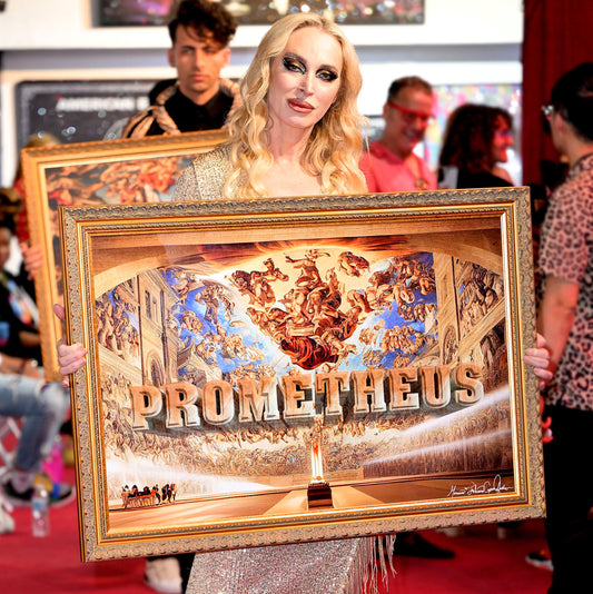 This Prometheus Collection painting, showcased in an ornate frame and signed by Mariano Feliciano and Caprio Jackson, presents a dynamic blend of classical art and augmented reality (AR) technology. The artwork features mythological figures ascending and descending, seemingly part of a grand celestial scene. The word "PROMETHEUS" stands boldly across the center, adding a modern twist to the otherwise traditional composition.
