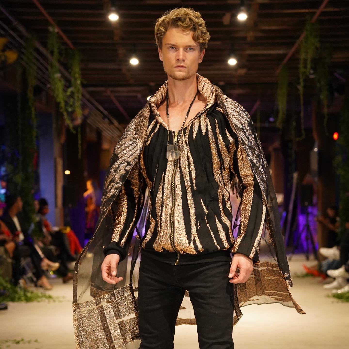Explore the Gawdy Gold Cape from Mariano Feliciano signature PROMETHEUS collection! This Unisex Kimono cape will have you feeling like a greek God or Goddess.